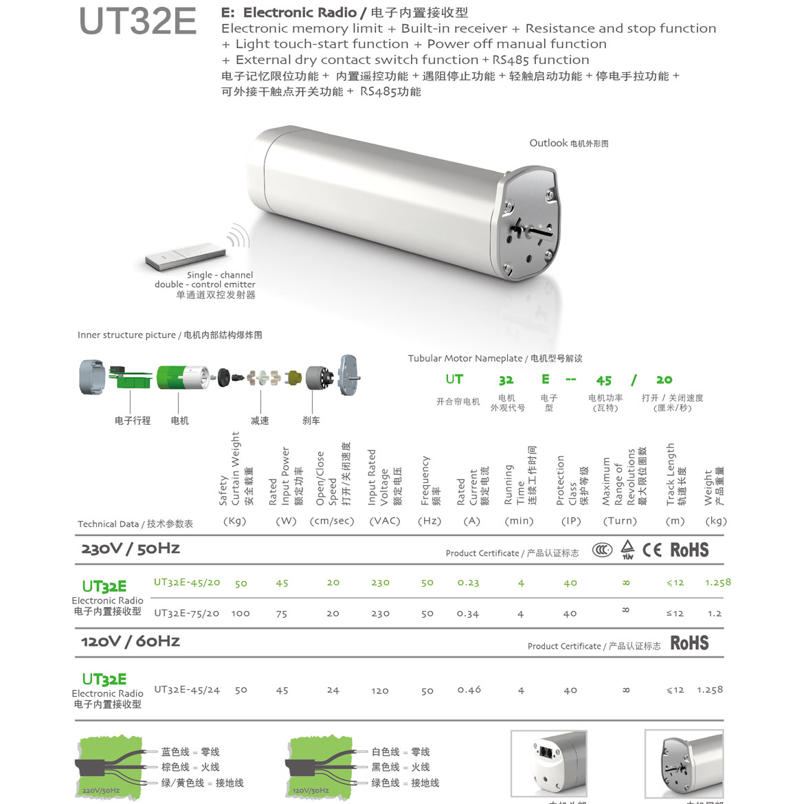 電子記憶限位功能+內置遙控功能+遇阻停止功能+輕觸啟動功能+停電手拉功能+第三行程點功能+可外接干觸點開關功能